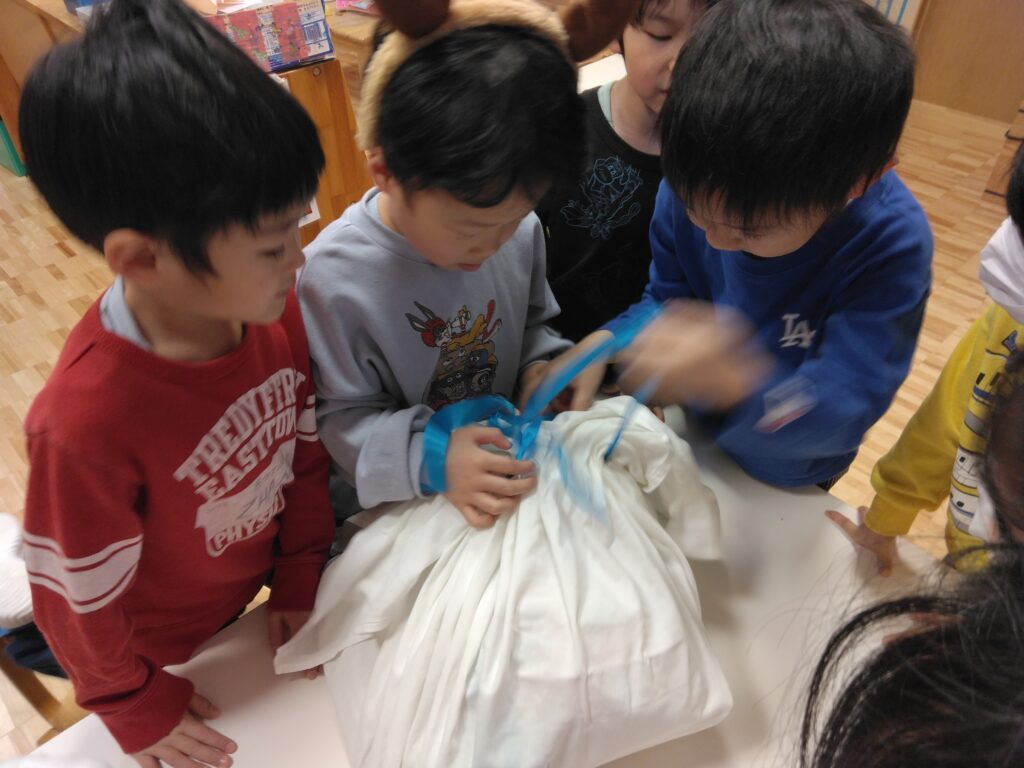 こども園にはサンタさんから手紙が届いていました!読んでみると「お菓子を隠したので探してね」と書いてあり、みんなでお菓子探しをしました。